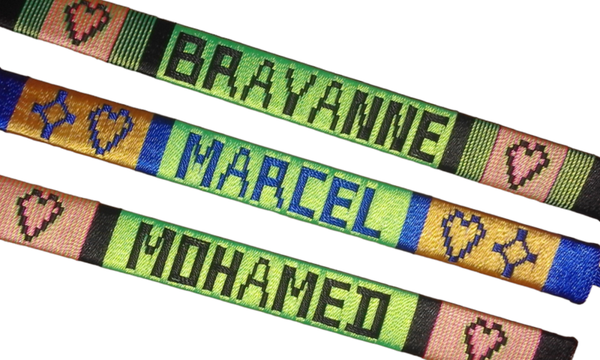 - C'est un bracelet personnalisé sur mesure sur lequel est inscrit le nom que vous voulez avec les couleurs de votre choix. Vous pouvez aussi y faire inscrire des chiffres, des lettres ou encore une combinaison des deux. Vous pouvez également y faire inscrire deux noms (pour un couple ou des amis par exemple). Cependant, nous tenons à vous informer que moins il y a de caractères mieux c'est. Il peut arriver que nous communiquons avec vous sur votre commande pour vous informer que le nombre de caractères que vous avez demandés à inscrire sur le bracelet ne pourrait pas y figurer car étant trop long (cas rares).