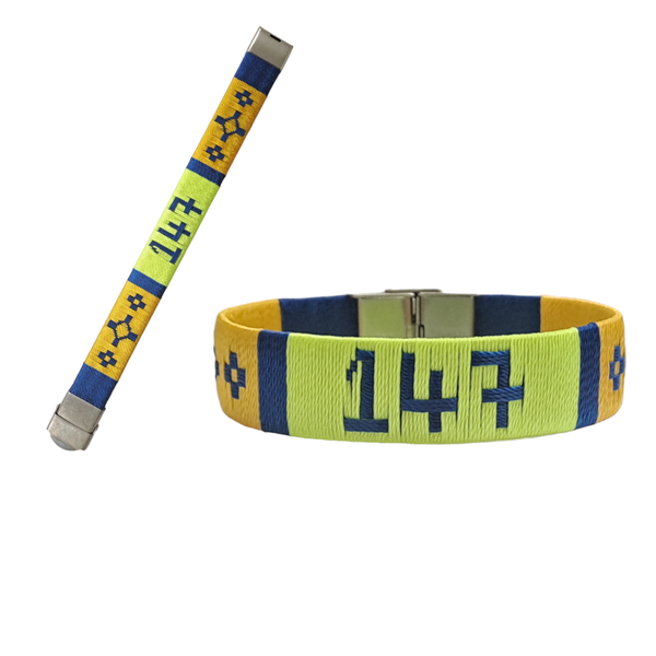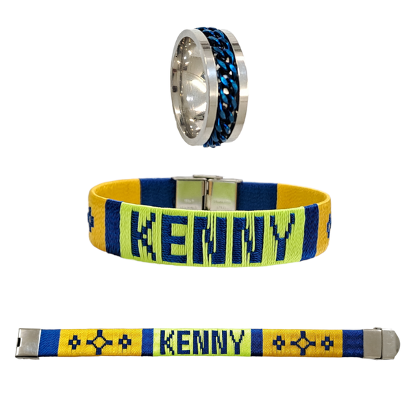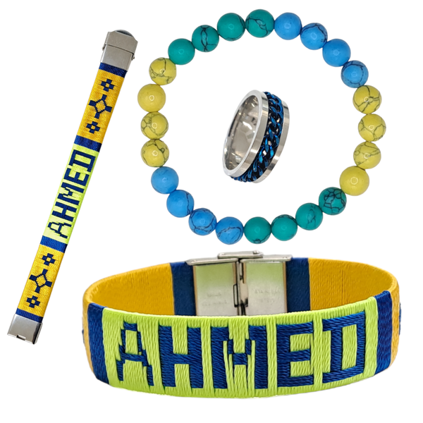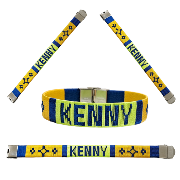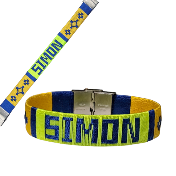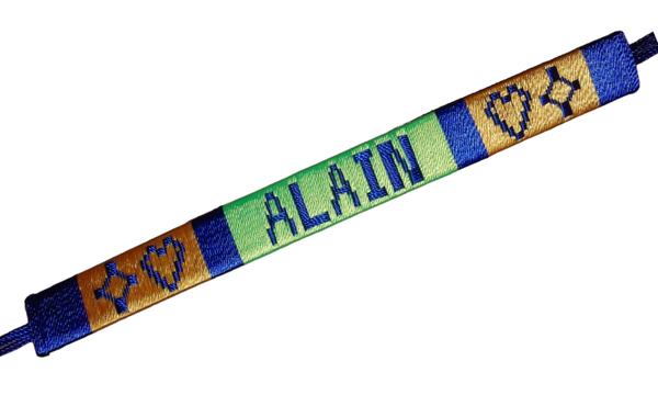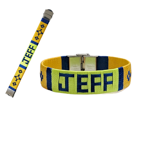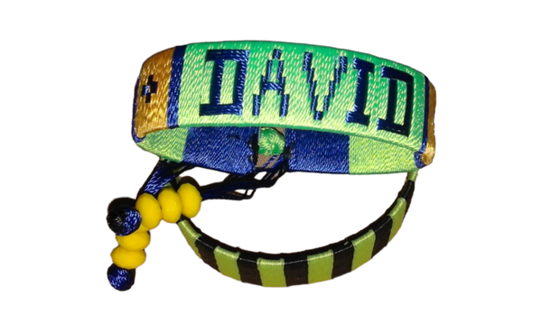- Les couleurs utilisées pour ce bracelet en image sont: bleu-roi, vert-citron et jaune. Vous pouvez commander exactement ce modèle avec le(s) nom(s) que vous désirez écrire, les couleurs de votre choix et bien entendu sur mesure. S'agissant des bracelets personnalisés avec un nom, il y a une infinité de combinaisons de couleurs et de modèles. De ce fait, nous vous invitons à nous écrire pour nous faire part des spécifications que vous désirez pour votre commande personnalisée.