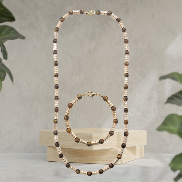 C'est un très beau collier fait de perle de taille légère (oeil de tigre sable 6mm) et d'accessoire en laiton plaqué or 18k. Par sa finesse il est idéal pour les personnes qui préfèrent les bijoux de style simple. Le modèle est personnalisable et disponible avec d'autres types de perles et matériaux. Nous vous invitons de ce fait à consulter les autres catégories d'articles.
