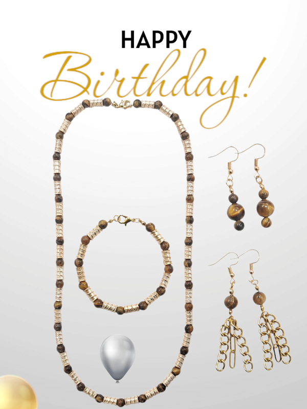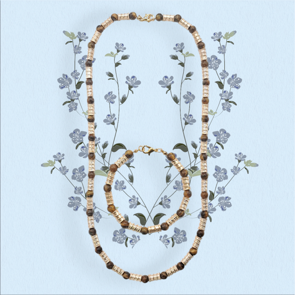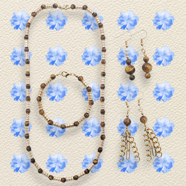 Il s'agit d'un ensemble de collier et bracelet très beaux, complémentaires et faits de perle de taille légère (Oeil de tigre: 6mm) et d'accessoire en laiton plaqué or 18k sans oublier les paires de boucle d'oreilles pour les accompagner au besoin. Par leur finesse, ils constituent l'idéal pour les personnes qui préfèrent les bijoux de style simple. Nous vous proponsons aussi des boucles d'oreilles pour les accompagner au besoin.