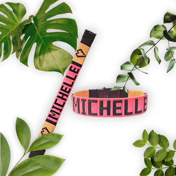 - Les couleurs utilisées pour ce bracelet en image sont: rose, noir et vert-citron. Vous pouvez commander exactement ce modèle avec le(s) nom(s) que vous désirez écrire, les couleurs de votre choix et bien entendu sur mesure. S'agissant des bracelets personnalisés avec un nom, il y a une infinité de combinaisons de couleurs et de modèles. De ce fait, nous vous invitons à nous écrire pour nous faire part des spécifications que vous désirez pour votre commande personnalisée.