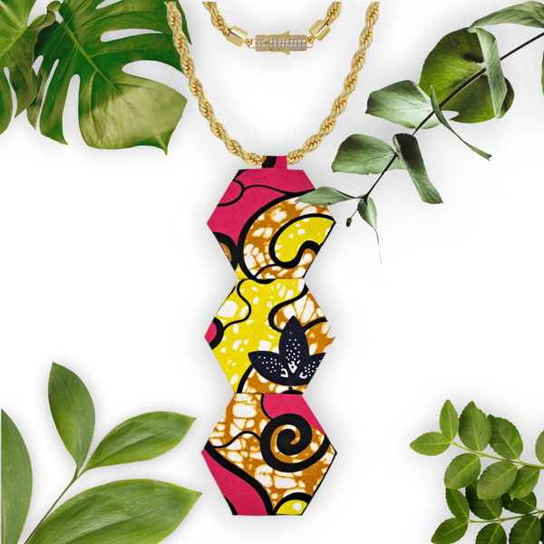 - C'est un beau collier composé d'un pendentif en tissu et d'une chaine torsadée 5mm en acier inoxydable plaqué or 18k portant un fermoir recouvert de zircon. Le pendentif en tissu mesure 21 cm.