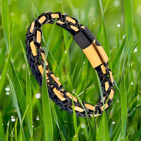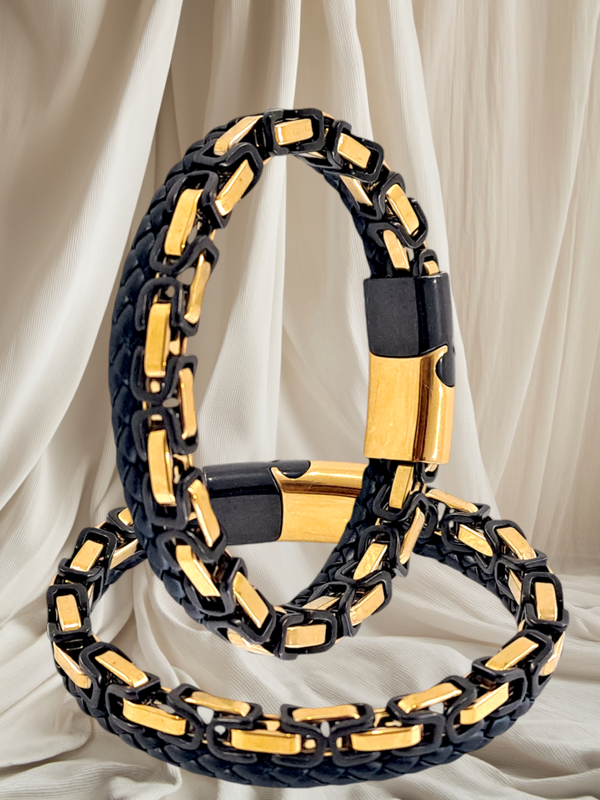 - C'est un très beau bracelet en cuir et de chaine acier inoxydable de style byzantine en deux couleurs : plaqué or 18k et noir.