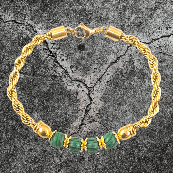 - C'est un très beau bracelet en chaine acier inoxydable 5mm plaqué or 18k et la perle malachite. Le bracelet est aussi disponible avec la chaine en couleur argent.