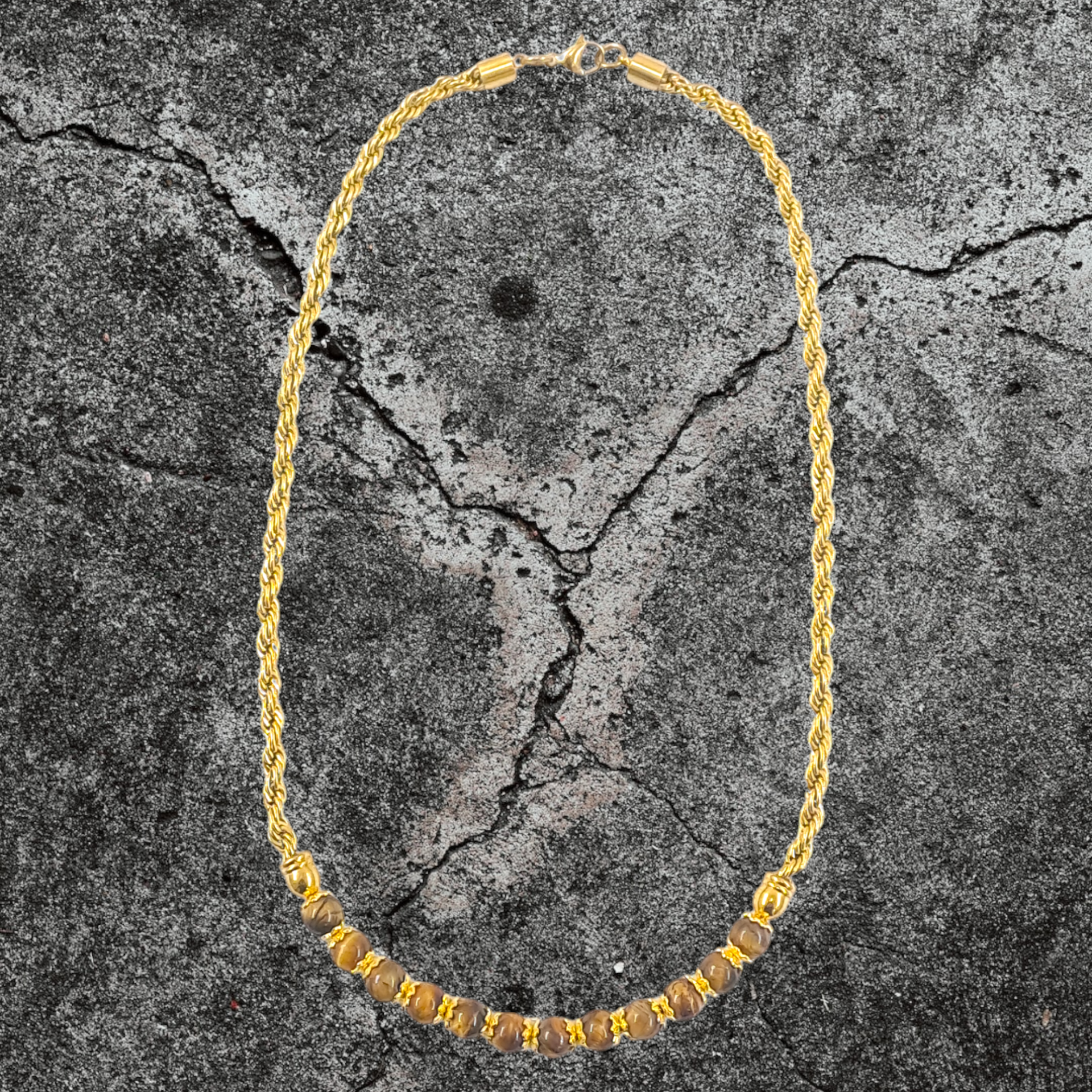 - C'est un très beau collier en chaine torsadée acier inoxydable 5mm, plaqué or 18k et la perle oeil de tigre. Le collier est aussi disponible avec la chaine en couleur argent.