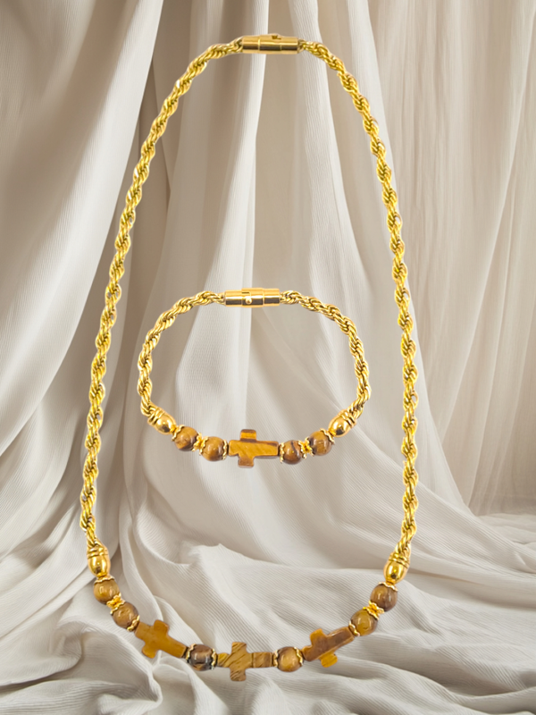 - C'est un très bel ensemble d'un collier et d'un bracelet en chaine torsadée acier inoxydable 5mm, plaqué or 18k et la perle oeil de tigre, avec un fermoir aimanté en acier inoxydable. L'ensemble est aussi disponible avec la chaine en couleur argent.