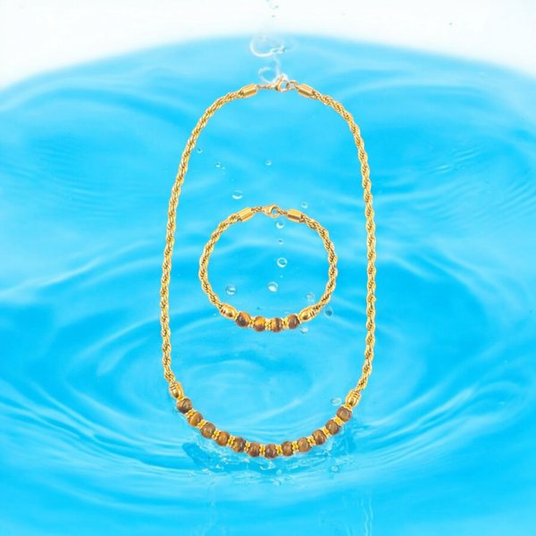 - C'est un très bel ensemble d'un collier et d'un bracelet en chaine torsadée acier inoxydable 5mm, plaqué or 18k et la perle oeil de tigre. L'ensemble est aussi disponible avec la chaine en couleur argent.