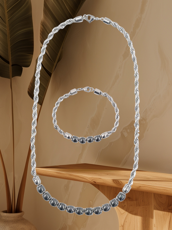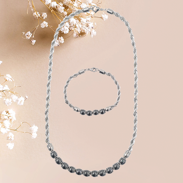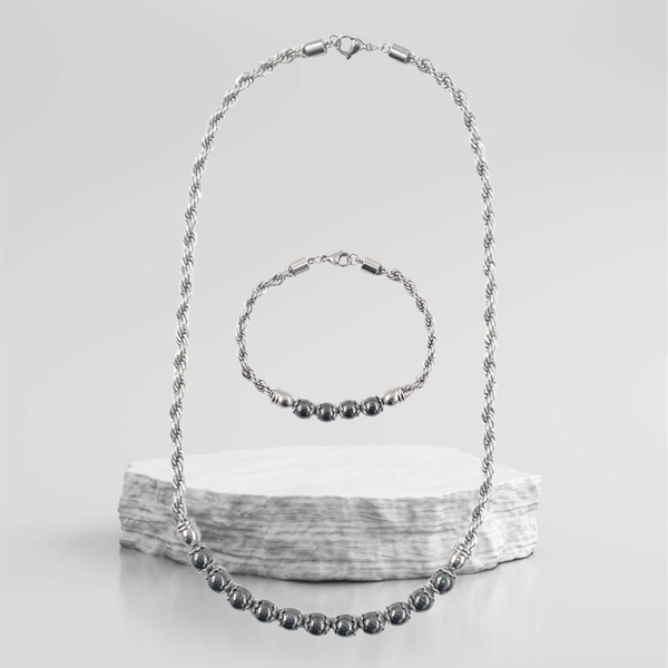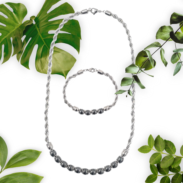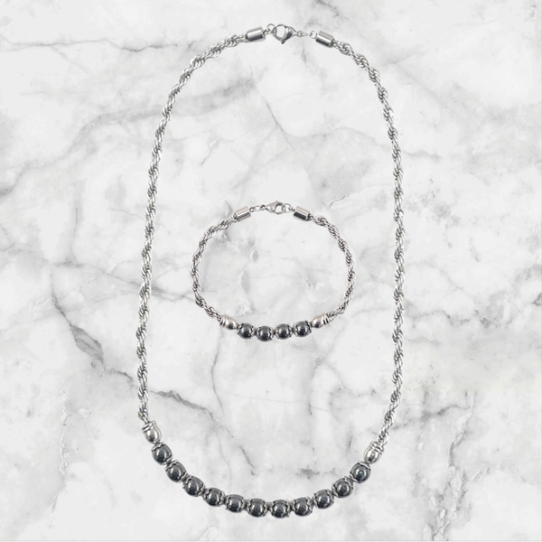 - C'est un très bel ensemble d'un collier et d'un bracelet en chaine torsadée acier inoxydable 5mm et la perle hématite.