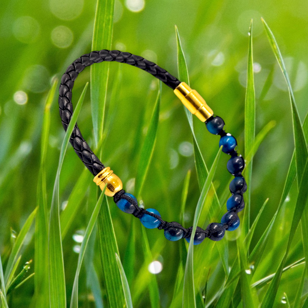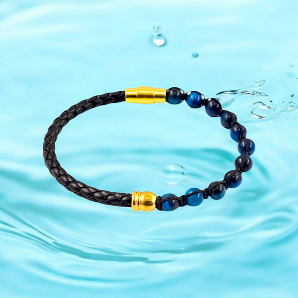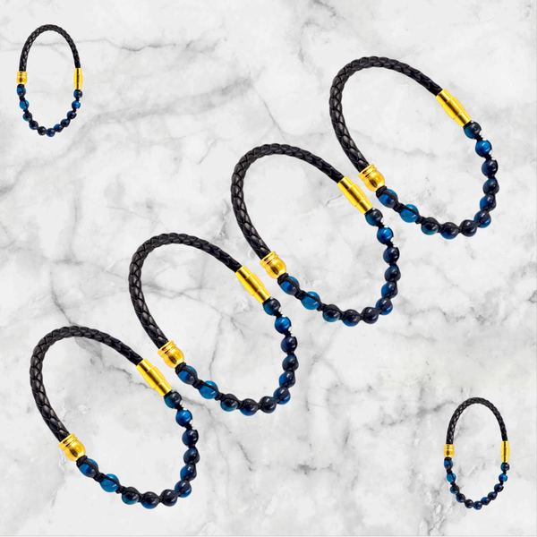● C'est un très beau bracelet en cuir UP et en perle oeil de tigre bleu clair tressée avec du fil nylon.