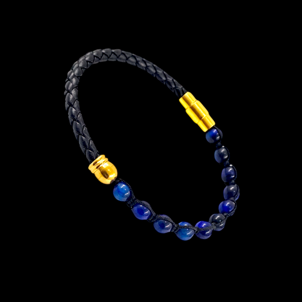 ● C'est un très beau bracelet en cuir UP et en perle oeil de tigre bleu roi tressée avec du fil nylon.