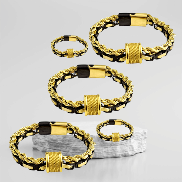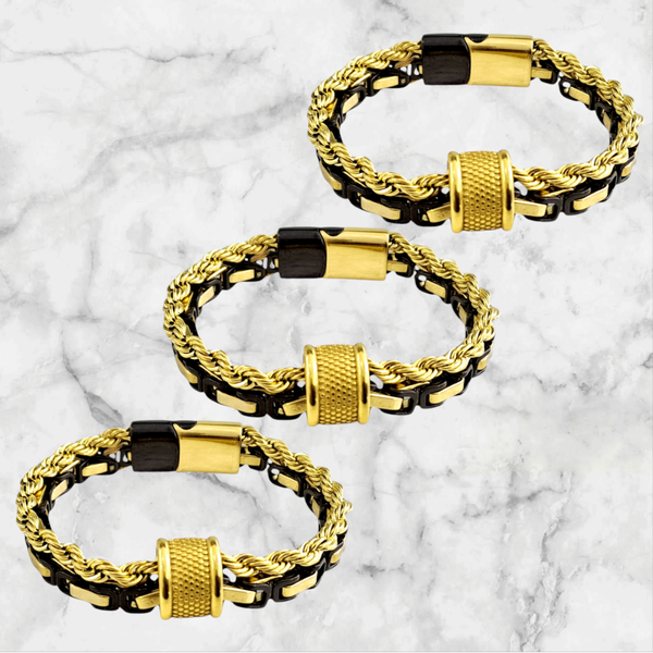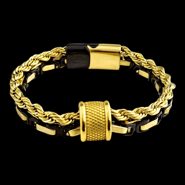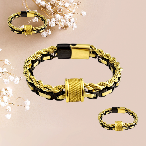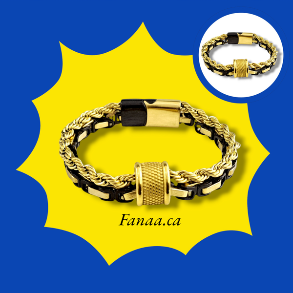 ● C'est un très beau bracelet en deux types de chaines en acier inoxydable: la byzantine plaquée en noir et or 18k et la torsadée plaquée or 18k.
