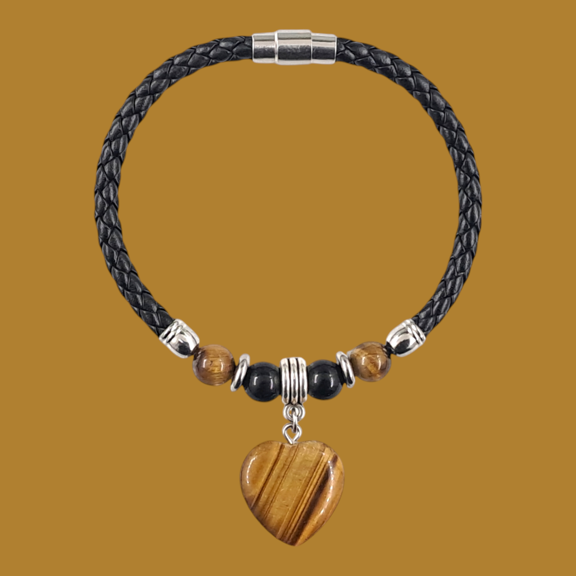 ● C'est un très beau bracelet en perle oeil de tigre et du cuir Up, avec un fermoir aimanté.