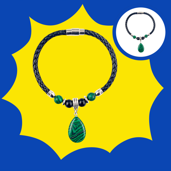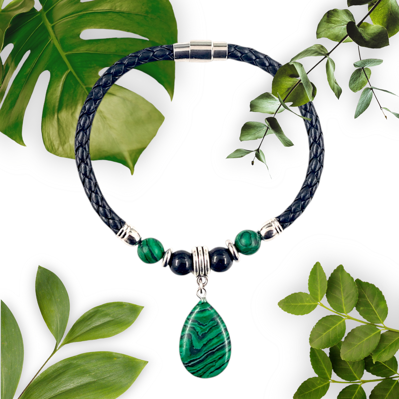 ● C'est un très beau bracelet en perle de malachite et du cuir Up, avec un fermoir aimanté.
