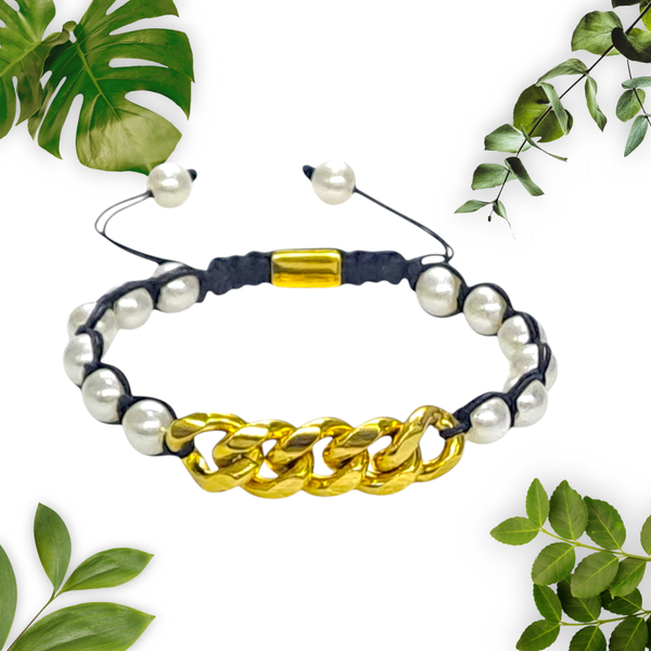 ● C'est un très beau bracelet en perle ABS et une courte chaine cubaine de 5 maillons en acier inoxydable plaqué or 18K. Le bracelet est ajustable.