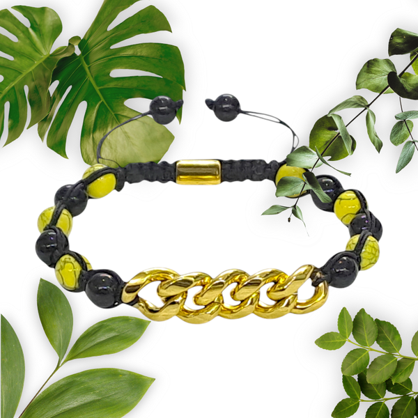 ● C'est un très beau bracelet en perle howlite jaune, perle de cristal noir et une courte chaine cubaine de 5 maillons en acier inoxydable plaqué or 18K. Le bracelet est ajustable.