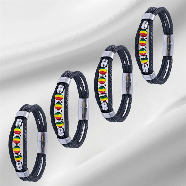 • C'est un très beau bracelet en perle unie vert-jaune-rouge, du cuir et autres matériaux de fabrication en acier inoxydable.