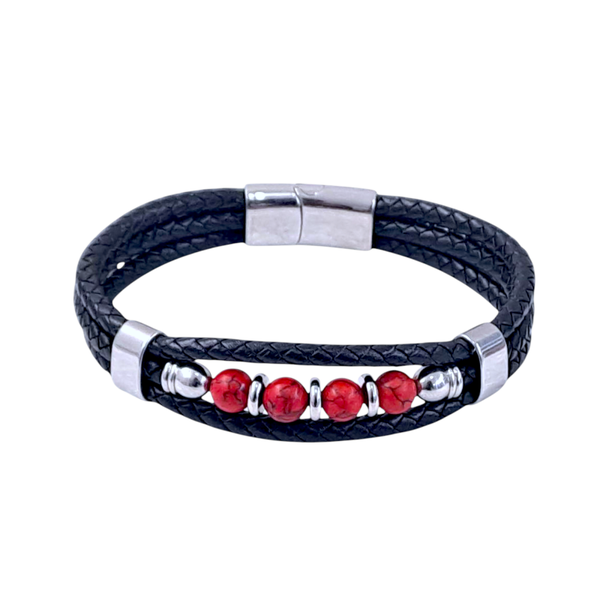 - C'est un très beau bracelet en perle howlite rouge, du cuir et autres matériaux de fabrication en acier inoxydable.