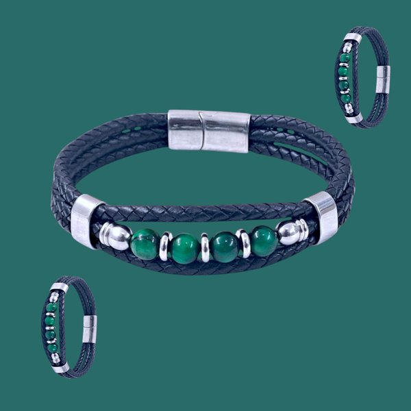 • C'est un très beau bracelet en perle oeil de tigre vert, du cuir et autres matériaux de fabrication en acier inoxydable.