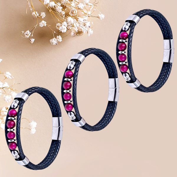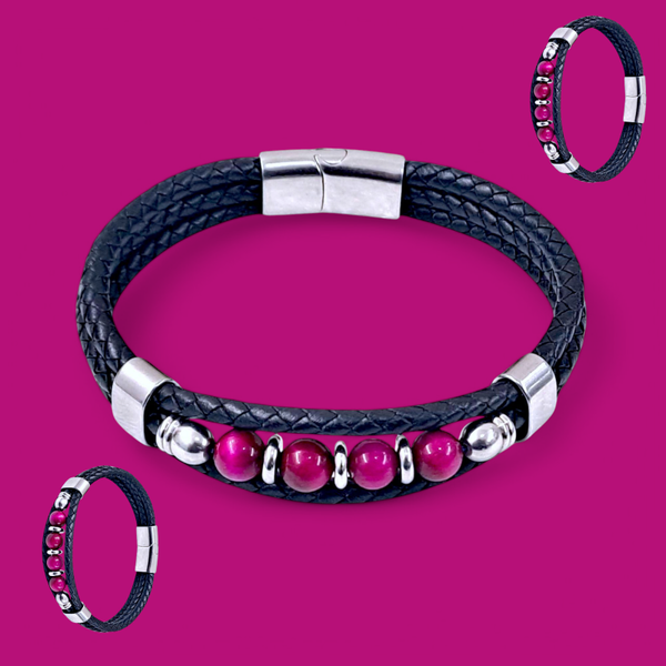 - C'est un très beau bracelet en perle oeil de tigre rose violacé, du cuir et autres matériaux de fabrication en acier inoxydable.