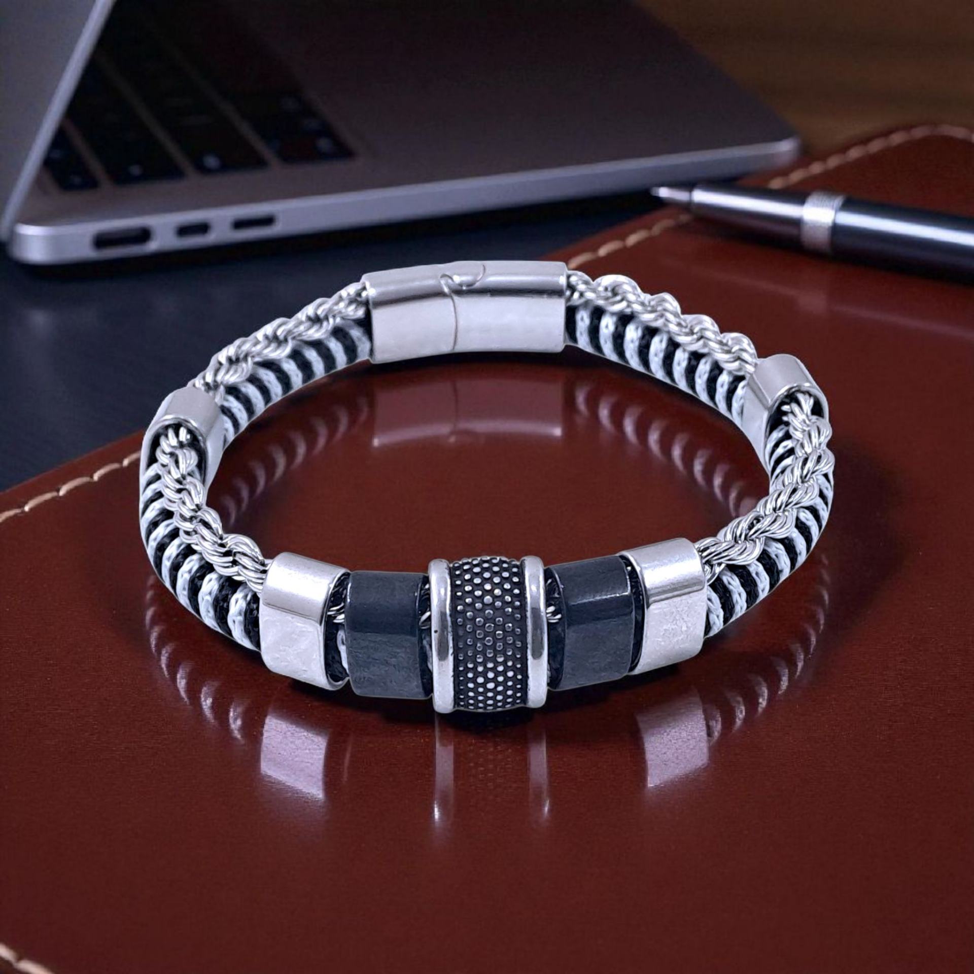 • C'est un très beau bracelet en fil nylon paracorde tressé et une chaine torsadée en acier inoxydable,  le tout avec des embouts en acier inoxydable.