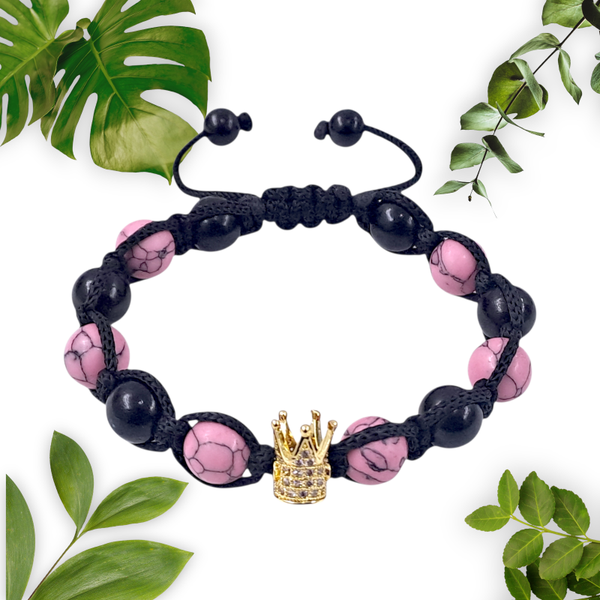 - C'est un très beau bracelet / collier artisanal ajustable (fait main) en perle howlite peinte en rose et ABS noir, tressé avec du fil nylon paracorde et orné d'une couronne sertie de zircons.