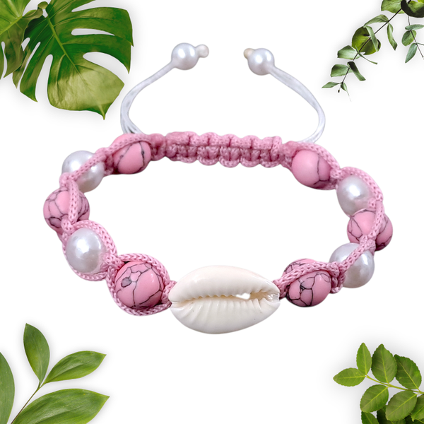 - C'est un très beau bracelet / collier artisanal ajustable (fait main) en perle howlite peinte en rose et ABS blanc, tressé avec du fil nylon paracorde et orné d'un coquillage de mer.